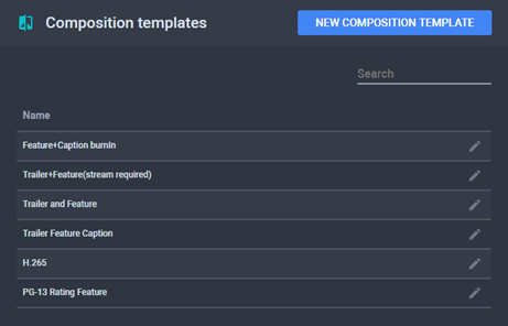 The Composition Templates menu contains a list of templates which allow you to concatenate multiple media segments and to attach pre-rolls, bugs, timed text etc. to the feature of a title.