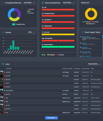 The Dashboard menu offers you an overview of jobs, batches, asset charts, notifications for validation errors, as well as a history of jobs which you can filter by Status.